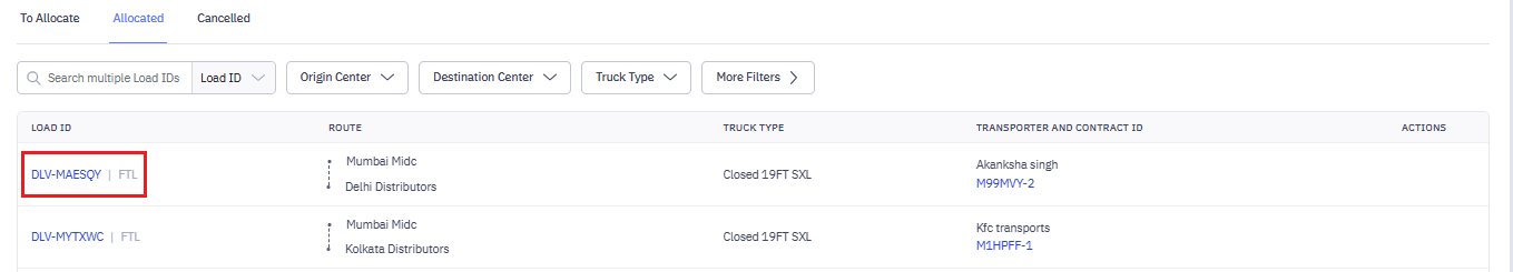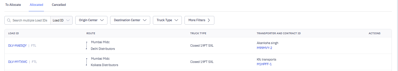 Created loads will appear in the To allocate tab. After the load is created, you will allocate contracts to the transporter.