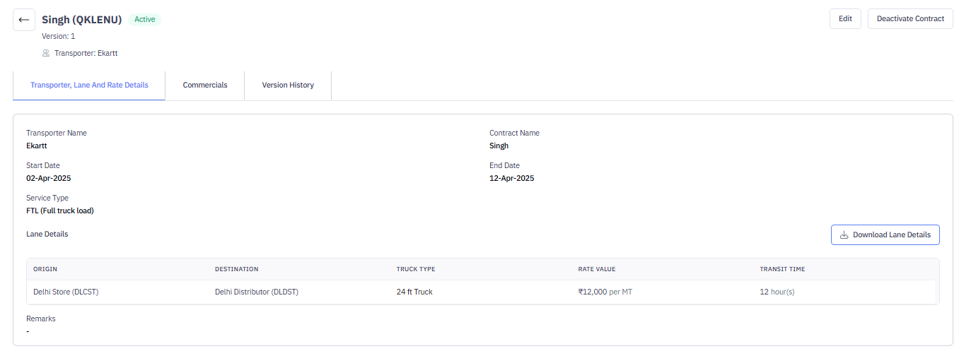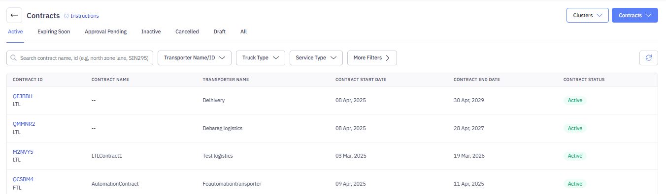 The Contracts Master in the Transportation Management System (TMS) that allows your organization to define and manage agreements with transporters. These agreements include all the essential details needed to plan and execute shipments — such as lanes (origin to destination), truck types, rate structures, transit SLAs, and commercial terms like detention charges or loading fees.