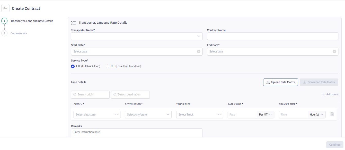 2. In Transporter, Lane, and Rate Details, define the basic details of the contract, including transporter name, contract duration, service type, and lane-wise rate configurations.