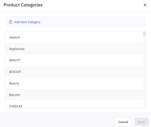 The Product Categories section allows users to manage product classifications efficiently. Users can add new categories to ensure accurate product organization.