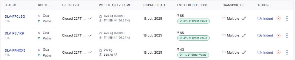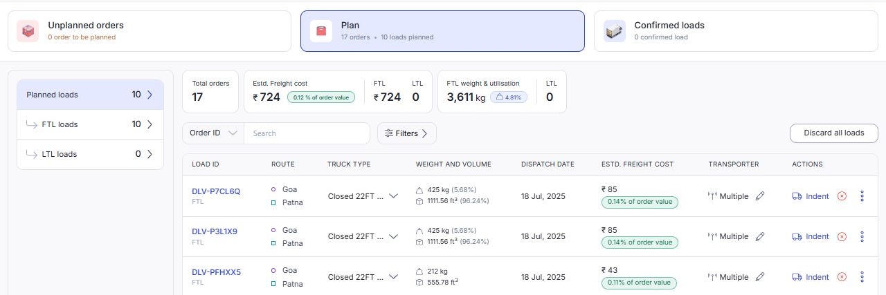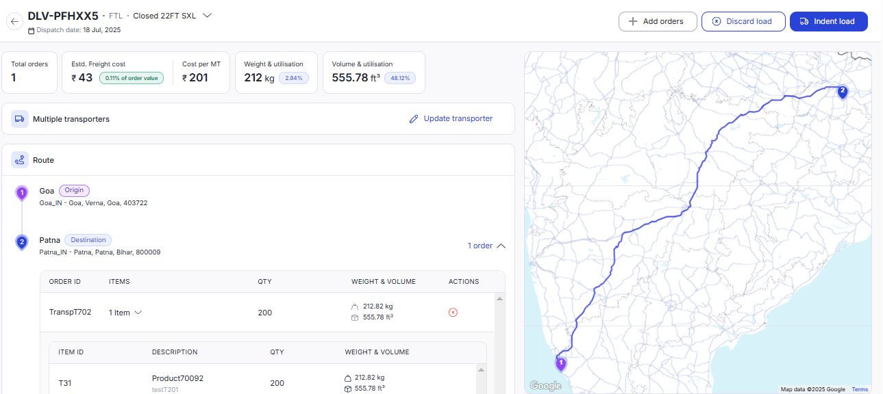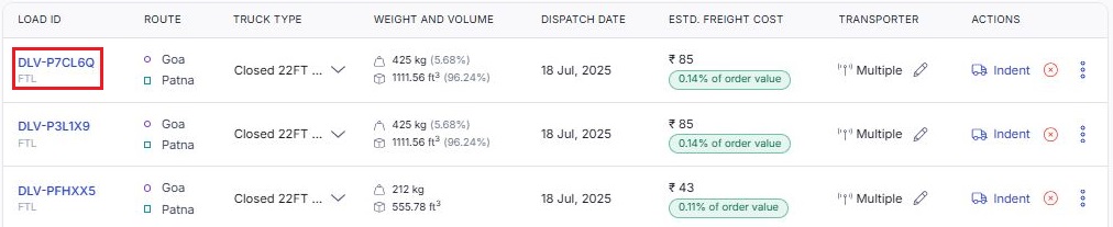 2. When you click on a Load ID from the Plan tab, it opens the Load Detail Page. This page helps you review and finalize the load before confirming or indenting.