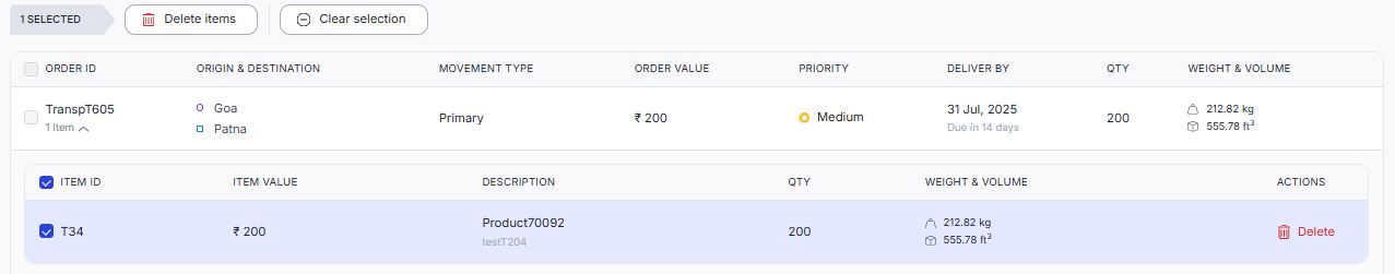 For each order, you can see what’s inside (items, weight, volume) and remove any order if needed. - Check and update the transporter