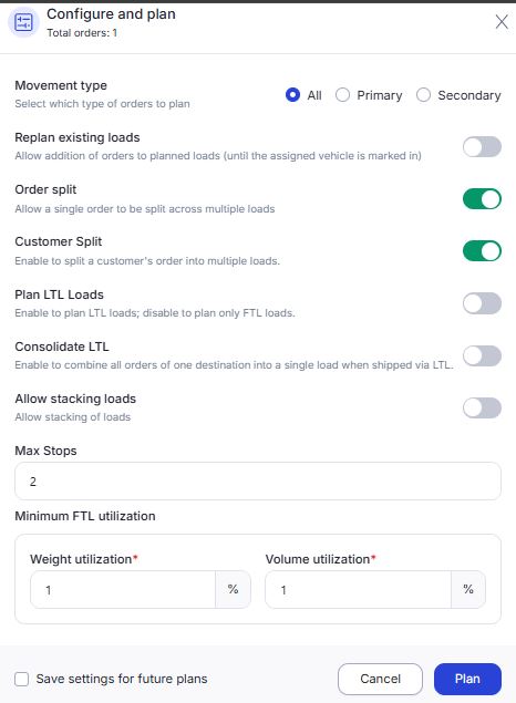 - Max stops, Plan LTL, Consolidate LTL, etc.
