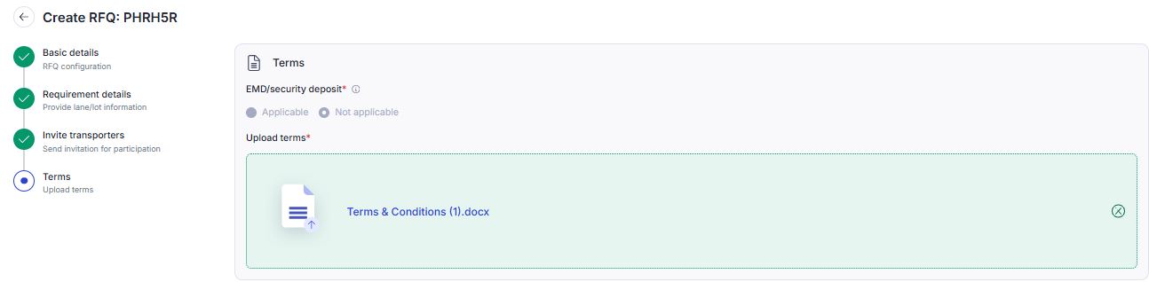 The uploaded document will be visible for transporter reference once the RFQ is published.