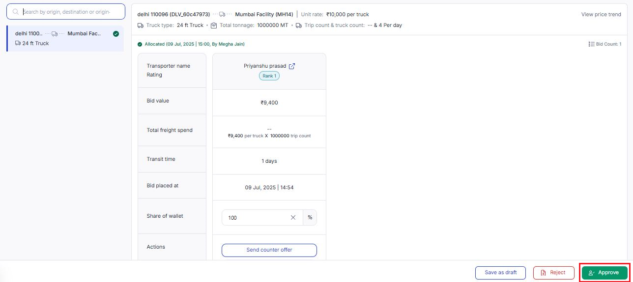 - Allocate share (optional): If multiple transporters have placed competitive bids, you can split the work using Share of Wallet (%).