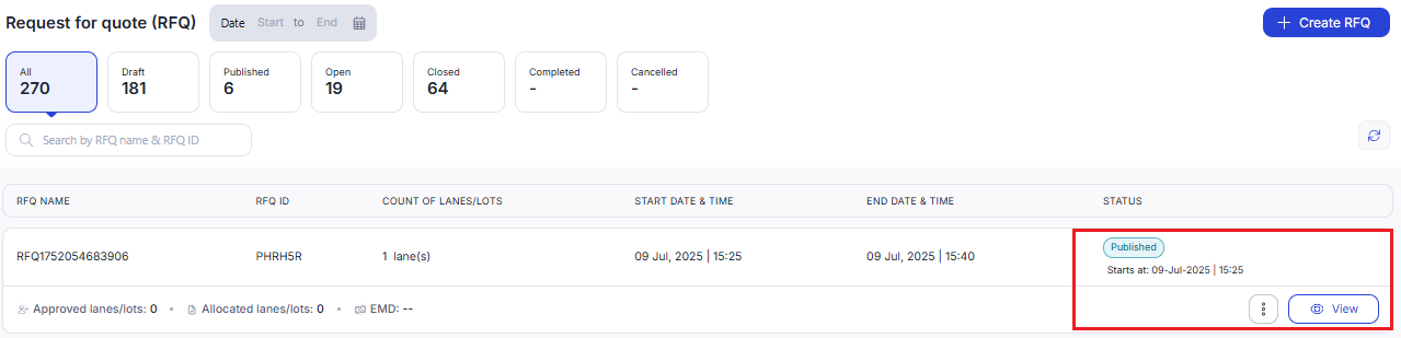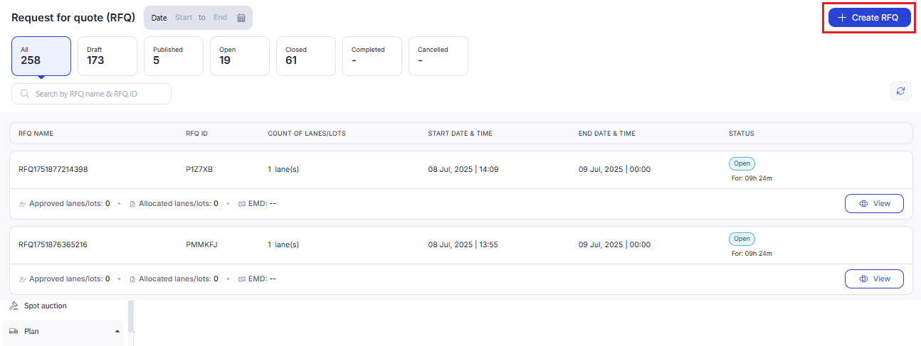 - You’ll land on the RFQ listing screen where all your existing RFQs are shown.