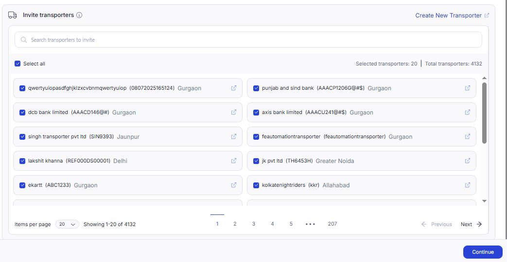 - Select transporters one by one using the checkboxes, or click Select all to invite all on the list.