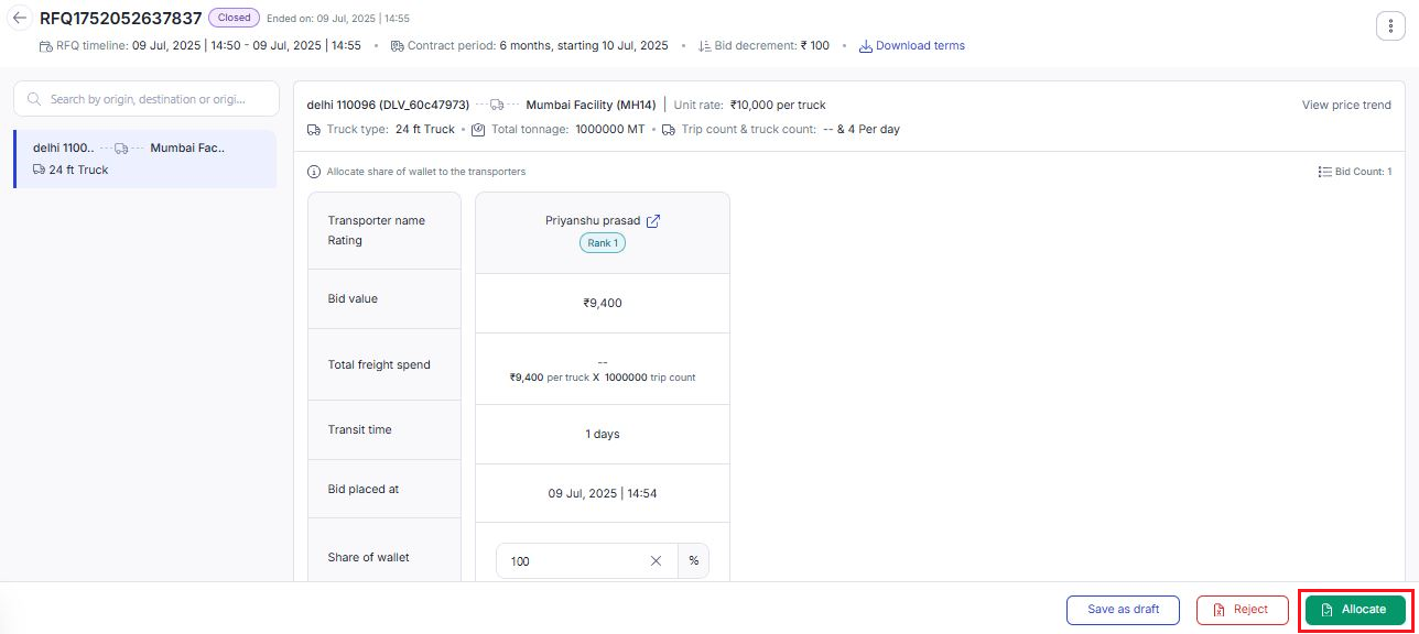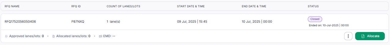 Once the bidding window ends and at least one transporter has submitted a bid, you’ll see an Allocate button appear next to the RFQ on the listing screen.