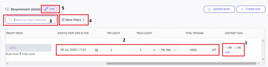 You can directly update details like: Bidding start time, Trip count, Truck count, Tonnage, Contract SOW (e.g., L1:50, L2:50) using the Edit link. - Search bar