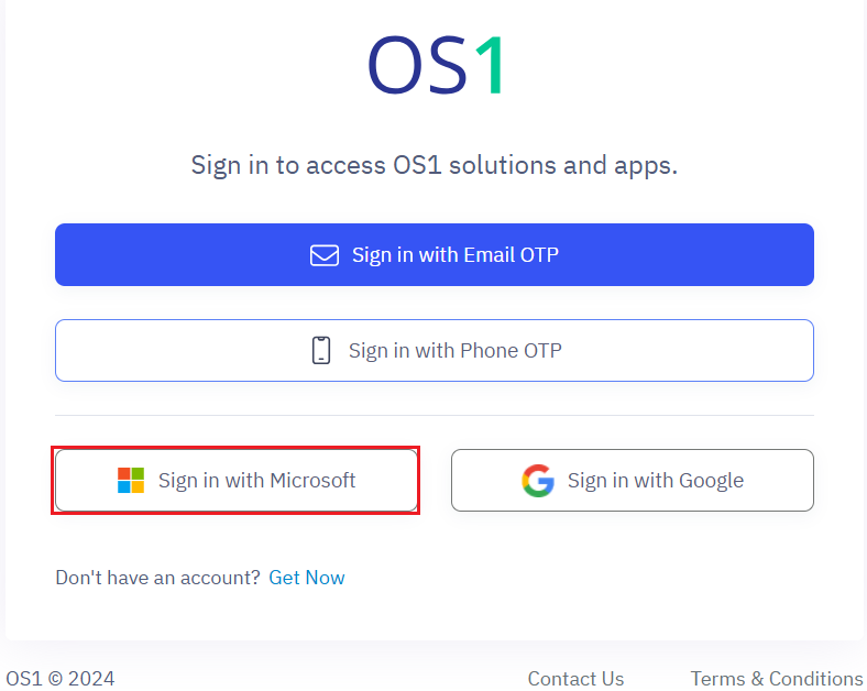 You can sign in to TransportOne Management System through your OS1 account securely using Single Sign-On (SSO) with Email OTP, Phone OTP, Microsoft, or Google. You can sign in using Single Sign-On (SSO). Choose one of the following methods: