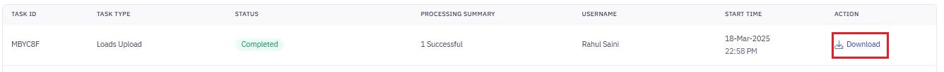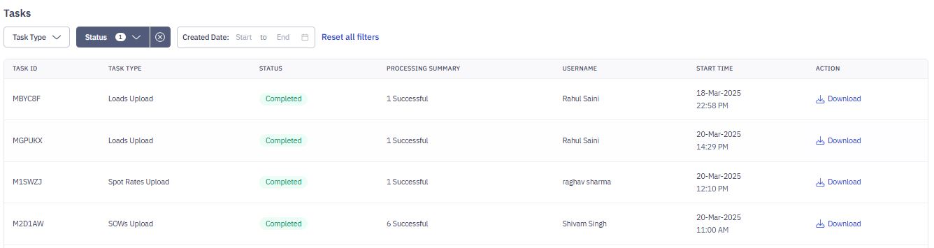 - Task Type: Type of upload (e.g., Invoices Upload, Payments Upload, Contracts Upload).